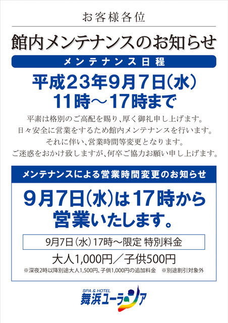 ´ÛÆâ¥á¥ó¥Æ¥Ê¥ó¥¹¤Ë¤è¤ê¡¢2011ǯ9·î7Æü¡Ê¿å¡Ë¤Ï17»þ¤«¤é±Ä¶È¤¤¤¿¤·¤Þ¤¹¡£ 2011ǯ9·î7Æü¡Ê¿å¡Ë17»þ¡Á¸ÂÄêÆÃÊÌÎÁ¶â Âç¿Í£±¡¤£°£°£°±ß¡¡»Ò¶¡£µ£°£°±ß ¢¨¿¼Ìë2»þ°Ê¹ßÊÌÅÓÂç¿Í£±£µ£°£°±ß¡¢»Ò¶¡£±£°£°£°¤ÎÄɲÃÎÁ¶â ¢¨ÊÌÅÓ³ä°úÂоݳ°