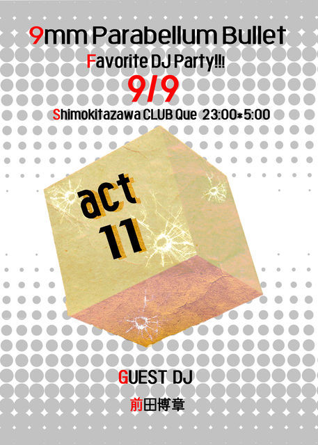 管理人様、告知失礼致しますm(_ _)m そして、9mm Parabellum Bulletコミュの皆様、いつもお世話になっております。 今回もよろしくお願いしますm(_ _)m ご予約はこのトピックとメール予約にて行います。 方法は下記の告知文に載せてあります。 本文を最後までよくお読みの上(特にクローク説明&予約方法&注意事項。)、ご予約をよろしくお願いしますm(__)m ------------------------------------------------------------------------------------- 【act 11】 元祖、9mm Parabellum Bulletを特集し