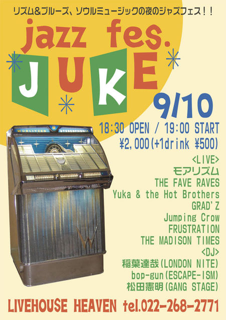 来る9月10日(土)、11日(日)と開催される 恒例の仙台定禅寺ストリートジャズフェスティバル 、 今年もFAVE RAVESが来てくれる事になりました! ?2011年9月10日(土) 榴岡公園野外音楽堂 15:10〜出演 そして夜はSOUL&BLUES BAR「HEAVEN」で豪華な夜版フェスを開催いたします。 もちろん、FAVE RAVESも出演!! 豪華なDJ陣と、濃い共演バンドと共に、 ジャズフェス週末のDEEPな夜をお楽しみください! ?夜のジャズフェス「JAZZ FES.JUKE」 2011年9月10日(土) LIVEHOUSE 「 HEAVEN 」 仙台市青葉区国分町3-1-12 山下ビ