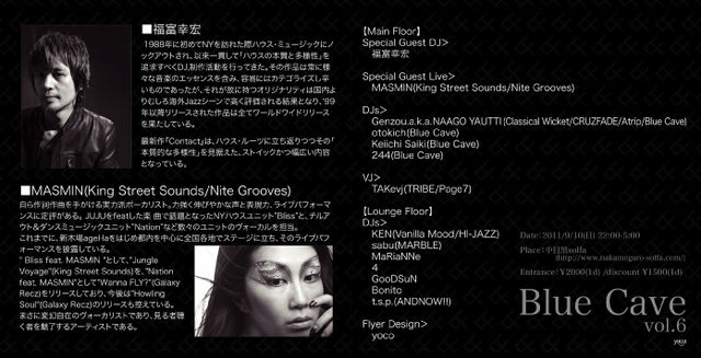 9月10日Blue Cave#6開催します! 是非遊びに来て下さい!! ★★★★★★★★★★★★★★★★★★★★★★ 『Blue Cave vol.6』 ◆開催日:2011/9/10(土) ◆開催場所:中目黒solfa (http://www.nakameguro-solfa.com/) ◆開催時間:22:00-05:00 ◆入場料:¥2000(1d) /discount \1500(1d) ◆more info:(http://iflyer.tv/solfa/event/89477-Blue-Cave-vol.6/) 【Main Floor】 Special Guest DJ> 福富幸宏 Special Guest Live> MASMIN(King Street Sounds/Nite Grooves) DJs> Genzou.a.k.a. N