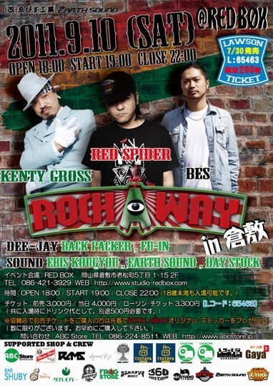 管理人様。 告知させて頂きます。 ゑびす工業 & EARTH SOUND PRESENTS 【ROCK AWAY in 倉敷】 2011年9月10日(SAT) 会場:RED BOX 〒710-0826 岡山県倉敷市老松町5丁目 1-15 2F TEL : 086-421-3929 OPEN 18:00 / START 19:00 / CLOSE 22:00 (※22時までですので18歳未満も入場可能です。) 【TICKET】 前売 : 3,000円 当日 : 4,000円 ローソン チケット : 3,300円 Lコード:65463 (7/30発売) (共にドリンク代が必要です。) ※協賛店で前売TICKETを購入の方には先着で『ROCK AWAYオリジナル ステッカー』