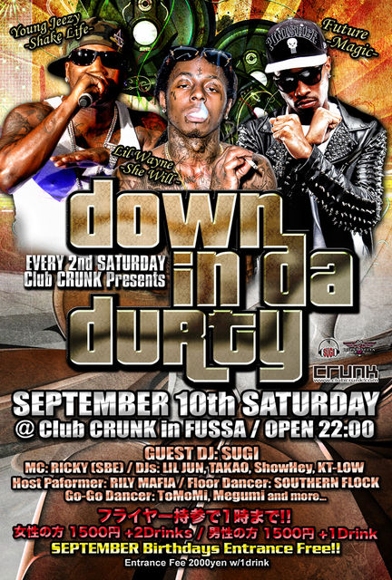 管理人様、告知失礼します。 不適切でしたら削除の方宜しくお願いします。 毎月第二週目、福生Club CRUNKの土曜日は"DOWN IN DA DURTY" GUEST DJにはSUGIを迎え、毎月豪華な出演者と共に福生Club CRUNKを熱く盛り上げています 日本で今が旬な間違いない"SOUTH"を聞けるのはこの"DOWN IN DA DURTY" -Every 2nd Saturday- "Down In Da Durty" 2011.9/10 (土) 22:00-5:00 @福生Club CRUNK 22:00-5:00 ▼入場料▼ 2.000yen /1d ▼Guest DJ▼ SUGI ▼MC▼ RICKY (SBE) ▼DJs▼ LIL JUN, TAKAO, S