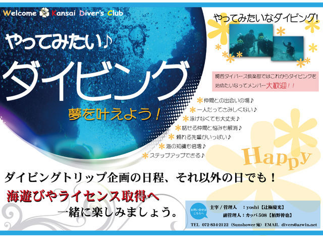 ━━━━━━━━━━━━━━━━━━━━━━━━━━━━━━━━━ ★ DIVING ☆ 南紀 ☆ ダイビングトリップ☆ 南紀 ☆ DIVING ★ ━━━━━━━━━━━━━━━━━━━━━━━━━━━━━━━━━ 関西ダイバーズ倶楽部メンバーの皆さんへ 9月の2days南紀ダイブトリップのご案内です 2daysならではの、観光スポット巡り、BBQや温泉タイム 車中、便乗のメンバーの皆のリクエストで旅のシナリオが決まります そして、学生気分になれる民宿でのナイト