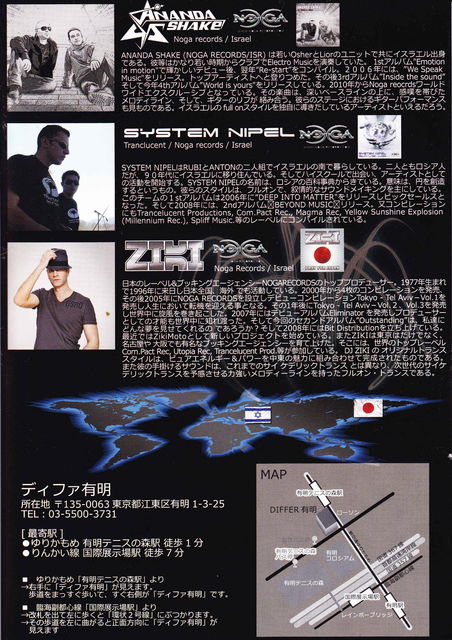 9月10日(sat)ディファ有明 ANANDA SHAKE SYSTEM NIPEL ZIKI Atlantis×Territory SYSTEM NIPEL【SAVE US】 ZIKI 【PRAY FOR JAPAN】 新譜リリースPARTY IN JAPAN ■料金 : 当日 \7000 5000円の前売り券は完売しました。 受付で団長のゲストと 言ってもらえれば ディスカウント6000円で入れます start 22:00〜 ■■MAIN FLOOR■■ PSYCHEDELIC ANANDA SHAKE(NOGA RECORDS) SYSTEM NIPEL(NOGA RECORDS) ZIKI (NOGA RECORDS) 団長 (NOGA RECORDS/K-HOLE) T&T (Atlantis Records) S&S (A