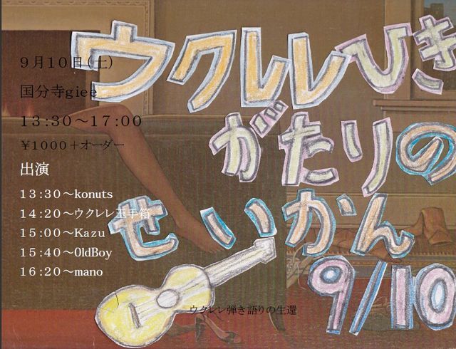 昨年も開催した「ウクレレの弾き語りの逆襲」に次ぐ第二弾! 今年のタイトル名はマイナーチェンジで"生還"です。 総勢10人のウクレレ弾きが弾き語ります。 気軽にお越しいただけるイベントです。 予約は要りませんがもしお越しいただけるようでしたら「参加ボタン」をお願いたします。 ぜひお越しをお待ちしております。 ★★★★★★★★★ウクレレ弾き語りの生還★★★★★★★★★ 【日時】 9月10日(土) 13:30〜 タイムテーブル詳細は添付のフライヤーをご覧ください 【場所】 giee (JR国分寺駅北口徒歩三分)