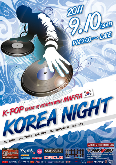 今回で8回目の開催となりました!! 6th、7thと300人を超える人に参加してもらい関西で1番多くの韓国人が集まるイベントになっており、K-popクラブイベントというだけでなく日韓交流の場所としても参加してもらいたいイベントになっています☆ 来たる、9月10日(土曜日) 宗右衛門町のクラブ「ヘブン」を貸し切って、大阪にある全ての韓国BARなどが力を合わせて、第8回コリアナイトを開催します。 今回も前回と同様、大阪にある全ての韓国BARなどの共同企画なので 今までのコリアナイトよりもさらにさらにスーパーパワ