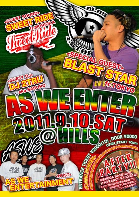 ★AS WE ENTERTAINMENT presents★ 【AS WE ENTER vol.2】 2011/9/10(SAT)@HILLS ・ENTRANCE TICKET ¥2000(1D),DOOR ¥2000 * FOREIGNERS ¥500(1SHOT) ・OPEN_START 10pm <SPECIAL GUEST> ・BLAST STAR fr.TOKYO <GUEST SOUND> ・SWEET RIDE fr.MORIOKA <GUEST DJ> ・DJ 2TRU aka.SABURO <FLOOR DANCER> ・ASKA ・URANUS ・MINE ・凸凹CATS ・MITTAN ・LILIY ・AKIHO ・HARUKA <HOST> ・AS WE ENTERTAINMENT -AFTER PARTY- @RAGGA BASE 3am〜 ・ENTRANCE ¥1000(1D) *AFTERのみのお客様の金額で