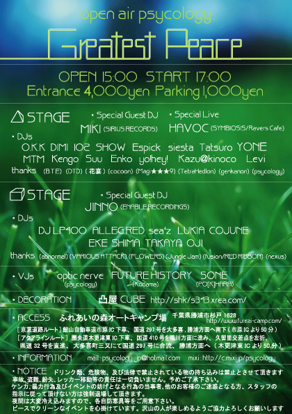 open air psycology 『Greatest Peace』 2011.9.10(sat)-11(sun) Open 15:00- Start 17:00- @ふれあいの森オートキャンプ場 千葉県勝浦市杉戸1628 http://www.fureai-camp.com Entrance Fee Door : 4,000yen Advance : 3,000yen Parking : 1,000yen(1台) =Line Up= -Trance Stage- Special Guest DJ MIKI (SIRIUS RECORDS) Special Live HAVOC (SYMBIOSIS/Raver's Cafe) DJs MTM (DTD) Kengo (DTD/Kaen) Suu (Magi★★★9) Enko (extra music) yo!hey! (cocoon) Kazu@Kinoco (Kaen) Levi O.K.K (psycolog