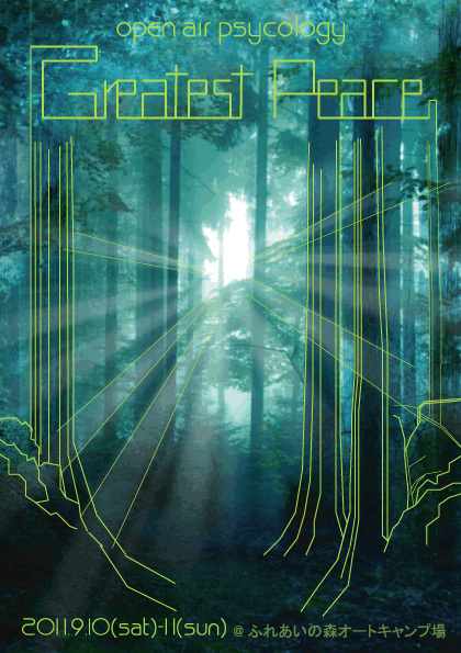 open air psycology 『Greatest Peace』 2011.9.10(sat)-11(sun) Open 15:00- Start 17:00- @ふれあいの森オートキャンプ場 千葉県勝浦市杉戸1628 http://www.fureai-camp.com Entrance Fee Door : 4,000yen Advance : 3,000yen Parking : 1,000yen(1台) =Line Up= -Trance Stage- Special Guest DJ MIKI (SIRIUS RECORDS) Special Live HAVOC (SYMBIOSIS/Raver's Cafe) DJs MTM (DTD) Kengo (DTD/Kaen) Suu (Magi★★★9) Enko (extra music) yo!hey! (cocoon)
