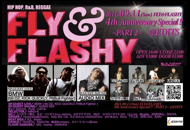 9月11日(日) ◆FLY&FLASHY〜4th Anniversary Special !!〜第二弾〜◆ 『FLY&FLASHY vol.49』 @EDITS OPEN 16:00/CLOSE 22:00 ADV ¥1000/DOOR ¥1500 ※来場者にはMIX CDをプレゼント!!(先着) ★SP.GUEST LIVE★ BMW [Mr.OZ,KICK QUICKLY,PitBull Fighter] ★SP.GUEST SOUND★ AUDIO MIX ★DJ★ DAICHI,PUN,CAT-D,BAU ★SELECTOR★ MIND-A ★MC★ スパゲティ博士,カズ・バンタナ(from OSAKA),カチクナマゴミ,RioT,ココロノヨリドコロ,Li-Luck,Begbie,ISOROKU ★SINGER