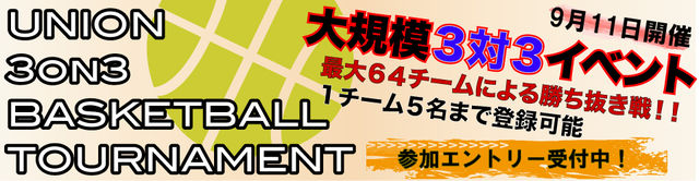 もしバス主催、3on3大会名「UNION」を開催します。 3on3 大会主旨 バスケットボール地域貢献とともに東日本大震災への復興支援を実現するためのイベントとなっております。 どなたでもお気軽に参加下さい! 開催要項 日付 平成23年9月11日(日) 場所 北名古屋市健康ドーム 2階アリーナ 時間 受付時間 9:30〜 開 会 式 9:45〜 大会開始 10:00~ 募集チーム数 64チーム (男女混合OK) ※女性特別ルールあり。詳しくは大会競技規則にて記載。 ※申し込み多数の場合、先着