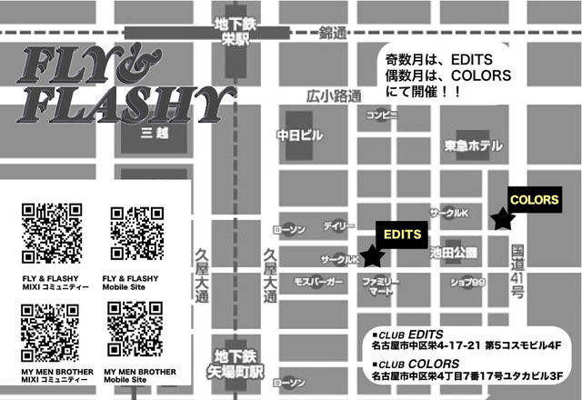 管理人様、貴重なスペース失礼致します。 Mr.OZ率いるBMWが名古屋でライブ! チケット取り置き希望の方は名前と人数をメッセージに添えて送信してください。気軽にお願いします! なおめんどくさい方は受付でしゅうやのカラーといえば前売りで入れます! お待ちしてます! 9月11日(日) ◆FLY&FLASHY〜4th Anniversary Special !!〜第二弾〜◆ 『FLY&FLASHY vol.49』 @EDITS OPEN 16:00/CLOSE 22:00 ADV ¥1000/DOOR ¥1500 ※来場者にはMIX CDをプレゼント!!(先着) ★SP