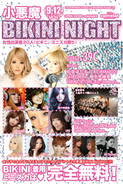 渋谷キャメロットで開催の人気イベント小悪魔ビキニNIGHT 女の子の為の女の子によるイベント 毎回500人超え 女性出演者30人 ビキニ着用の女の子は入場無料 ミニスカ着用の女の子も入場無料 ※入場時に自己申告してください。 DJ陣は今活躍している女の子DJが参戦 セクシータレントの紅音ほたるが登場 パフォーマンスに釘付け必至です ラジオDJとしても活躍のHERI 人気読モの畑中奈緒美もDJ参加 などなどの都内で人気の女性DJが