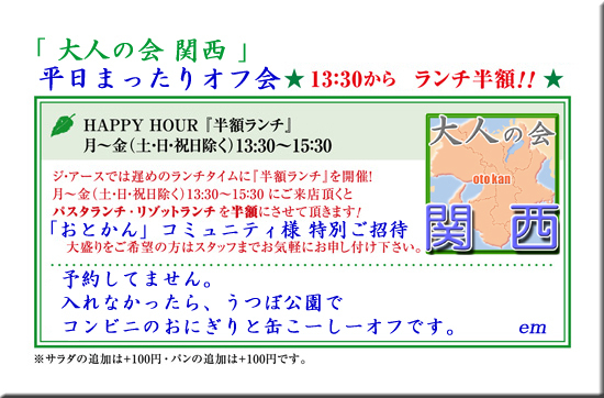 平日まったりオフ会 場所:「 ジ アース カフェ 」 うつぼ公園・本店 大阪市西区京町堀1-13-2 藤原ビル1F 06-6445-6262 http://www.earthcafe.jp/ http://r.tabelog.com/osaka/A2701/A270102/27000256/ 交通手段:地下鉄四つ橋線肥後橋駅 7番出口徒歩5分 地下鉄四つ橋線本町駅 28番出口徒歩5分 肥後橋駅から480m 時間:13:00〜 ←適当! 遅刻・早退自由 12時半くらいにはお店あたりに徘徊しておりますので、来れる方は適当にどうぞ〜〜〜 ※参加希望者が、お1人でもいらっしゃったら (そ