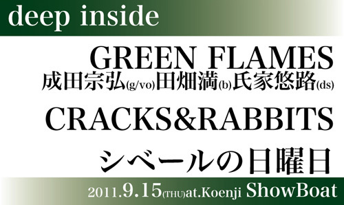 2010.9.15(THU)「deep inside」@高円寺ShowBoat 出演 ■GREEN FLAMES(成田宗弘+田畑満+氏家悠路) http://www.myspace.com/greenflames ・成田宗弘(Vo & G)(High Rise, 兇悪のインテンション) http://homepage2.nifty.com/highrise/narita.htm ・田畑満(b)(ZENI GEVA, LENINGRAD BLUES MACHINE, 20 GUILDERS, Wabo-Chao, Acid Mothers Temple & The Cosmic Inferno, etc.) http://www.tabatamitsuru.com/tabatamitsuru.html http://twitter.com/#!/Tabatamitsuru ・氏家悠路(Ds)(ex.The EXECUTE, Q.O.P, NURSE, Sha-