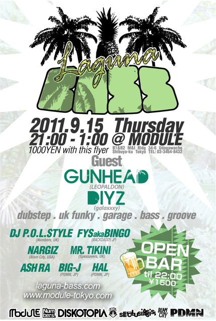 管理人様、告知をさせていただきます。 Laguna Bass 2011/9/15(THU)21:00- OPEN 21:00 ENTRANCE FEE 1000yen(with flyer) / 1500yen(door) 1500yenでご入場の方は22:00までカクテル飲み放題! GENRE Base Music / Dubstep / UK funky -GUEST- GUNHEAD (LEOPALDON) DIYZ (galaxxxy) FYSakaBINGO (MACKDADDY / JP) NARGIZ (Blam City / USA) MR. TIKINI (Spexsavers / UK) ASH RA BIG-J (PDMN / JP) HAL (PDMN / JP) http://iflyer.tv/event/90715 Module http://module-tokyo.com/schedule/2011/9/15/380/detai