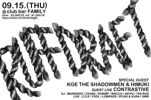 管理人様告知失礼致します。 7月から渋谷の老舗クラブFamilyで始まったNEW PARTY"RUFF DRAFT" 今月のSpecial GuestにはKGE THE SHADOWMEN & HIMUKI!! ディスカウント出来るのでお気軽にご連絡下さい! 09/15 (THU) RUFF DRAFT @club bar FAMILY Door : 2,000yen/1D w/f : 1,500yen/1D Open-Close 22:00-All Night SPECIAL GUEST KGE THE SHADOWMEN & HIMUKI GUEST LIVE CONTRASTIVE DJ’s MANDINGO CHUNS SHRIMP BISCCO AKIYO TEE-RUG LIVE Z.O.E (Re:Freshment Records) FOOL (Kamenoko Production) LOWPASS