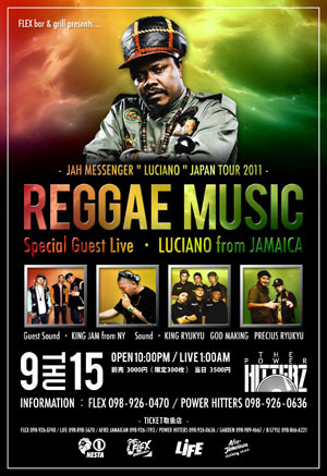 管理人様告知失礼致します。 いよいよ明日に迫ってきましたねー JAHメッセンジャー " LUCIANO "沖縄公演! NEWアルバムも超有名曲のカバーアルバムですごくおすすめです。 あのクリアーな声を是非ライブで聞いてください!! チケットまだの方下のプレイガイドにどうぞ! チケット/FLEX 098-926-0740 LIFE 098-898-5670      AFRO JAMAICAN 098-926-1193    POWER HITTERS 098-926-0636 GARDEN:098-989-4667 B-STYLE:098-866-6221      LOWSON Lコードは 81902 予約受付TELは 0570-084-008(L コード必要)