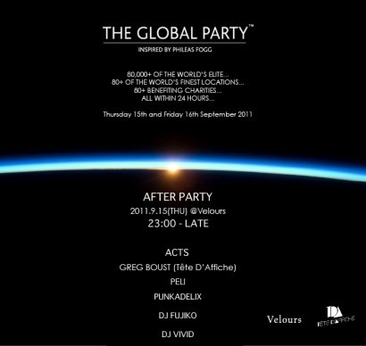 2011年9月15日(木)から16日(金)にかけて開催されるTHE GLOBAL PARTYは、世界中で最も影響力のある80,000人のゲストをお招きし、プレミアムブランドのご協力のもと、42カ国73都市にまたがる80カ所のラグジュアリーな会場にて開催されるチャリティーパーティーです。