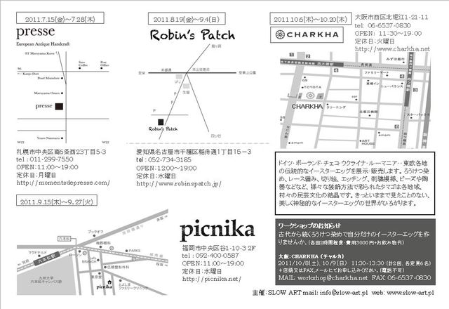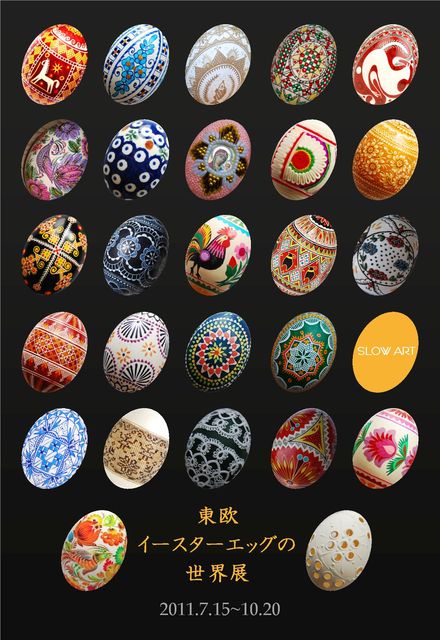 <東欧イースターエッグの世界展> ドイツ・ポーランド・チェコ・ウクライナ・ルーマニア・・東欧各地の伝統的なイースターエッグを展示・販売します。ろうけつ染め、レース編み、切り絵、エッチング、刺繍模様、ビーズや陶器などなど、様々な装飾方法で彩られたタマゴは各地域、村々の民芸文化の結晶です。きっといままで見たことのない、美しく神秘的なイースターエッグの世界がひろがります。 ■ 2011.9.15(木)〜9.27(火) 福岡picnika 福岡市中央区谷1-10-3 2F Tel: 092-400-0587 営業時間: 11:00〜19:00 定休日:水曜日 http://