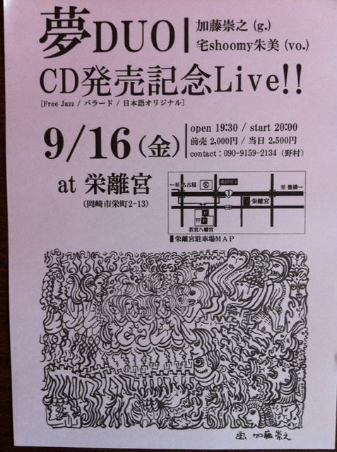 『夢』Duo 『ゆっくり夢見』CD発売記念ツアー @東海 加藤崇之さんと宅朱美さんのユニット『夢』Duo 東海エリアツアーのお知らせです。 9月15日(木)open19:00 start19:30 場所:愛知・豊橋 イタリア食堂 ノスタルジア酒場 (愛知県豊橋市花園町74 テントビル2F) 0532-39-5700 http://www.nostalgia2009.jp/ charge:2000円 予約はお店にお電話で 9月16日(金)open19:30 start20:00 場所:愛知