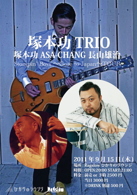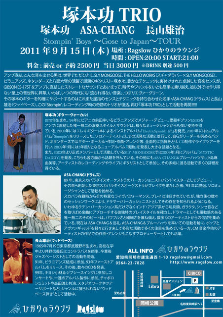 ASA-CHANG再び!!昨年のASA-CHANGのワークショップ以来2度目のRagslow!!今回はSLY MONGOOSE、THE HELLO WORKS等で活躍の塚本功率いる塚本功TRIOとしてひかりのラウンジにやって来ます!! 2011/09/15(木) 塚本功TRIO LIVE!! 塚本功 ASA-CHANG 長山雄治 場所 : Ragslowひかりのラウンジ 愛知県岡崎市康生通西1-9 0564-23-7829 時間 : OPEN20:00 START21:00 料金 : 前売or予約 2500円 当日3000円 ※ともに別途1DRINK500円 アンプ直結、こんな音を出せる男は、世界でただひとり。SLY MONGOOSE、THE HELLO WORKS(スチャダラパー×SLYMONGOO
