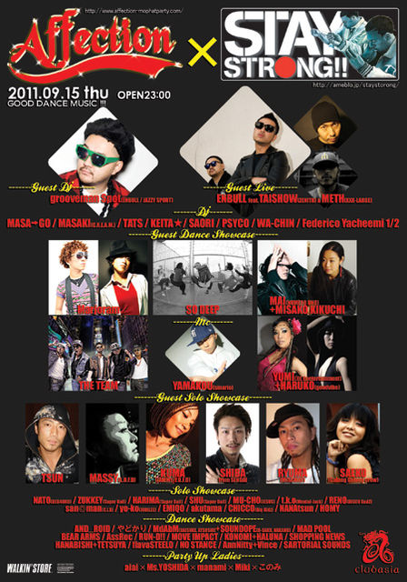 管理人様、書き込み失礼致します。 不適切でしたら削除の方、宜しくお願い致します。 ★★★★★★★★★★★★★★★★★★★★★★★★★★★★★★★★★ 2011.09/15(thu) Affection×STAY STRONG @clubasia HipHop, R&B and Good Dance Music!!! ★★★★★★★★★★★★★★★★★★★★★★★★★★★★★★★★★ 残暑厳しい9月。夏がまだまだ終わってほしくないと言わんばかりのそんな暑い9月に熱い一夜がやってきます! 3.11の東日本大震災後、MAIやTAISHOWをはじめとしたダンサーが団結し、東北被災地への支