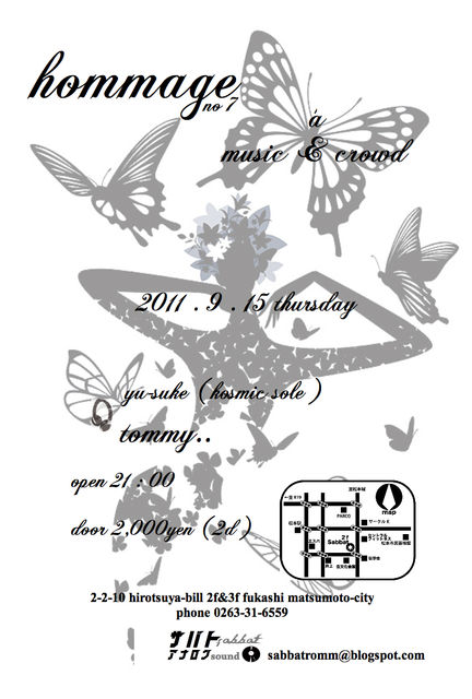 2011.9.15 thursday@sabbat DJ yu-suke (Kosmic sole) DJ tommy.. open:21:00 door:\2000 2drink サバト SABBAT 390-0815 長野県松本市深志2-2-10 広津屋ビル2F