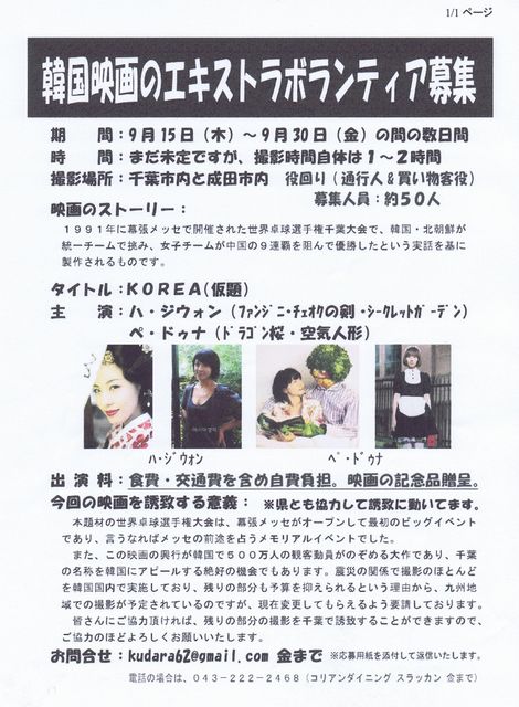 映画『KOREA』のエキストラを募集しています。 関東地方の方はぜひご応募を!! 拡散希望!! 1991年世界卓球選手権大会。千葉幕張メッセでは統一コリアチームが結成され、初めて統一旗が振られ、そして女子団体は優勝した。その実話帆もとにした映画です。 主演はハ・ジウォンとペ・ドゥナヽ(^o^)丿