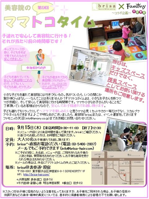 貴重なスペースをお借り致します。 毎回ご好評を頂いている『ママトコタイム』 第9回目を開催します 小さな子どもを連れて美容院には行きづらいもの。 気がついたら、いつの間にか髪が伸びっぱなし・・・ なんてことはありませんか? 『ママトコタイム』は、小さなお子さんを持つママが気軽に、 そして安心して美容院に行ける時間帯です。 ママや小さなお子さんがいることを ご了承頂いているお客様ばかりなので、 安心してお子様連れでお越し頂けます。 『ママトコタイム』では、 ママや小さなお子さんがいるこ