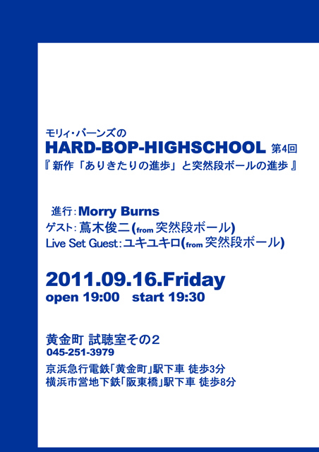 「モリィ・バーンズのHARD-BOP-HIGHSCHOOL 第4回」 2011 9.16(Fri)黄金町 試聴室その2 http://cafe.taf.co.jp/live/index.html 進行:Morry Burns ゲスト:蔦木俊二(from 突然段ボール) Live Set Guest:ユキユキロ(from 突然段ボール) 開場 19:00/開演 19:30 料金:予約 1,500円+order / 当日 1,800円+order ご予約フォーム:http://cafe.taf.co.jp/liveform/110916live.html ●今年で結成34年の突然段ボールが、前作からは3年ぶりとなるニュー・アルバム『ありきたりの進歩』(PCD-26036)を9月21日にP-VINE RECORDSよりリリー