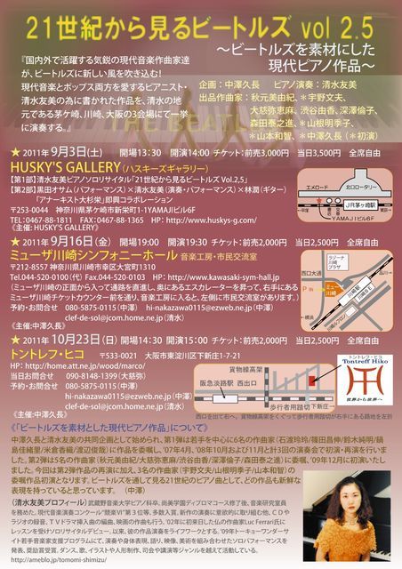 「21世紀から見るビートルズ Vol.2,5 〜ビートルズを素材にした現代ピアノ作品〜 」 『国内外で活躍する気鋭の現代音楽作曲家達が、ビートルズに新しい風を吹き込む! 現代音楽とポップス両方を愛するピアニスト・清水友美の為に書かれた作品を、 清水の地元である茅ケ崎、川崎、大阪の3会場にて一挙に演奏する。』 企画:中澤久長 ピアノ演奏:清水友美 出品作曲家:秋元美由紀、宇野文夫*、大慈弥恵麻、渋谷由香、深澤倫子、森田泰之進、山根明季子*、山本和智*、中澤久長* (*初演) ■2011年9月16日(金)開場19: