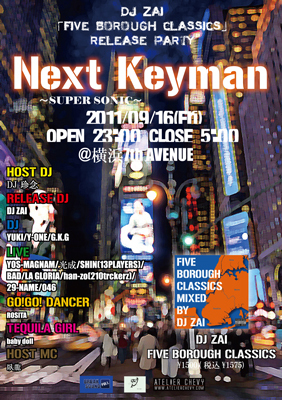 管理人様告知失礼致します。 明日は!!!!!!! 「Next Keyman 〜SUPER SONIC〜」 《DJ ZAI 「FIVE BOROUGH CLASSICS」RELEASE PARTY》 9/16(金) @横浜7th AVENUE(関内) 23:00〜5:00 (20歳未満入場不可、当日IDチェックあり!) 《HOST DJ》 DJ 珍念 http://ameblo.jp/djchinnen/ 《RELEASE DJ》 DJ ZAI http://ameblo.jp/djzai/ 《DJ》 YUKI/Y-ONE/G.K.G 《LIVE》 YOS-MAGNAM/光成/SHIN(13PLAYERS)/BAD/LA Gloria/han-zo(210trckerz)/29-NAME/046 《GO!GO! DANCER》 姫 MARIA(VAMONOCITA) ROSITA 《