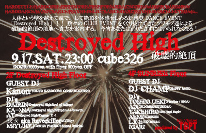 告知失礼します。 9月17日にまたもCube326でDestroyed Highを2フロアー使ってやります!! 2FはGUEST DJにTHCからGabberのKanonさん!! 4Fはキラキラと癒されるサウンドEuphoric Tranceなどで彩られるSUNRISE!! GUEST DJにHappy JackやHappy DynamaiteからHappy HardcoreやUK HardcoreのChampさん!! そしてゲストDJではないけどバイナライズやGigaのToshio uekiさんやダークサイケをPLAYするMIYUJYOUさんなんかも出演していただけます♪ 来月も見所満載ですのでよろしければ是非集ってお越しください。 ディスカントご希望