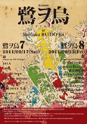 9/17(土) 新宿 RUIDOK4 「殻presents 鷺ヲ烏-サギヲカラス-7」 殼(Support Dr : ササブチヒロシ) / furly / Presence of soul / dibs / W.A.R.P. / DESTRUCT SYSTEM / Gabriels Stiletto / MUNIMUNI / 101A / 機械DOTEちん / DISH / frances bean DJ : KENZO-A (Gabriels Stiletto) / c.hashimoto (PARANOIA Night/CLUB PSYENCE) / Yaa-N (PARANOIA Night/CLUB PSYENCE) / nabe (PARANOIA Night) / ryosuke (PARANOIA Night) / migon 開場:16:30/開演:17:00(終演予定:5:00) 料金:2,500円(前売)/3,000円(当日) ※DRINK代別 ※再入