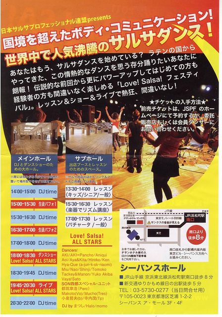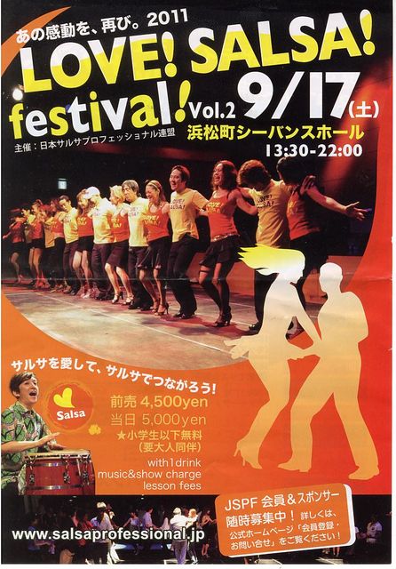 日本におけるラテンダンス“サルサ”の普及を目指すプロフェッショナル・インストラクター及びダンサーが集結した『日本サルサプロフェッショナル連盟(Japan Salsa Professional Federation、略称: JSPF)』が、あの伝説のイベントのシーズンがやって来ました!9月17日(土)、社交ダンスで有名な浜松町シーバンスホールに会場を移し、さらにゴージャスな雰囲気で『2011 LOVE!SALSA! festival』をお届けします! 会員プロダンサーの生徒チーム・パフォーマンス、プロダンサーによるダンスレッスンやダンスショー、そしてプロミュ