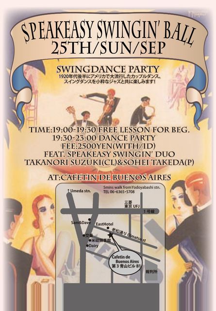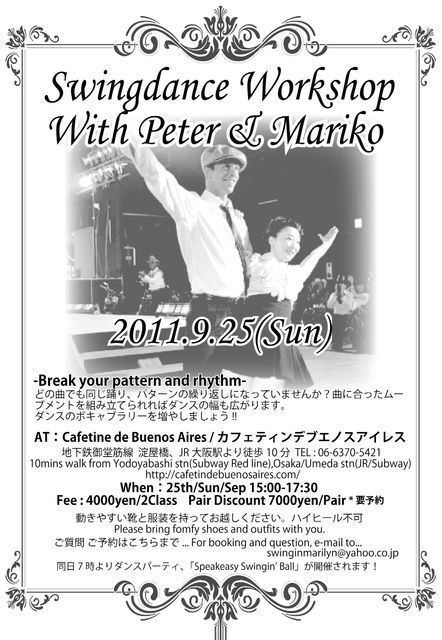 さくらんぼ スイングダンスワークショップ with Peter&Mariko -Break your pattern and rhythm- どの曲でも同じ踊り、パターンの繰り返しになっていませんか? 曲に合ったムーブメントを組み立てられればダンスの幅も広がります。 ダンスのボキャブラリーを増やしましょう!! -------------------------------------------------------- と き:9月25日(日) ところ:カフェティンデブエノスアイレス 大阪市北区西天満4–12-22 第3青山ビル地下1階 http://cafetindebuenosaires.com/ じかん:15:00-17:30 料金:4000円(2クラス)/1人