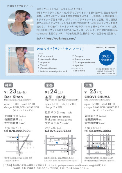東京中心に活躍するボササンバ弾き語りの若手ホープ 近田ゆうきが9月に関西でツアーを行います。 近田ゆうき「samba sem nome」 発売記念ライブin 関西2011 近田ゆうきオフィシャルサイト http://yu-kiringo.com/index.shtml サンバ、ボサノヴァが生まれた街、 リオデジャネイロで録音。 名手クリストーヴァン・バストス、 ディレクションによる、 ブラジルの空気と近田ゆうきの想いが ストレートに詰まったアルバムが完成!! ご予約は 各店舗の店頭、お電話(下記参照)にて承ります。 もしくは yoshiy