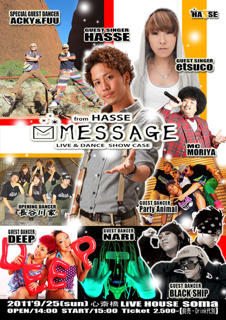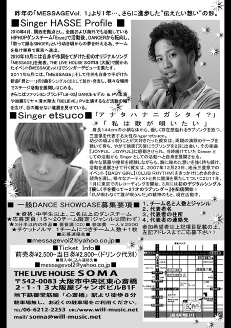 MESSAGE vol.2 日時 2011/9/25(sun) 場所 心斎橋LIVE HOUSE soma 開場 14:00 開演 15:00 終演 20:00 MC MORIYA GUEST DANCER ・BLACK SHIP ・DEEP ・NARI ・Party Animal GUEST SINGER ・HASSE ・etsuco SPECIAL GUEST DANCER ・ACKY&FUU OPENING DANCER ・長谷川家 〒542‐0083 大阪市中央区東心斎橋2‐1‐13 大阪屋ジャンボビルB1F TEL.06‐6212‐2253 / FAX.06‐6212‐2254 / soma@will-music.net 事務所/TEL.06-6212-2295 専用駐車場はあり