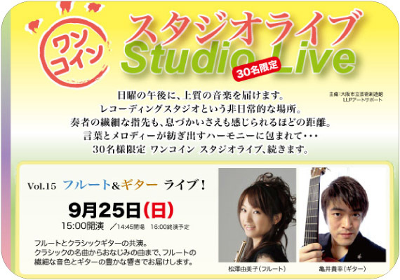 ワンコイン スタジオライブ vol.15「フルート&ギターライブ!」 場所:芸術創造館 時間:15:00〜16:00(受付・会場は開演の15分前) 料金:¥500 定員:30名(先着順) ACT:フルート松澤由美子 / ギター亀井貴幸 ----------------------------------- 大阪市立芸術創造館 大阪市旭区中宮1-11-14 電話:06-6955-1066 http://artcomplex.net/art-space/ <アクセス> 大阪市営地下鉄谷町線 千林大宮駅から徒歩10分 京阪本線 森小路駅から徒歩10分 -----------------------------------