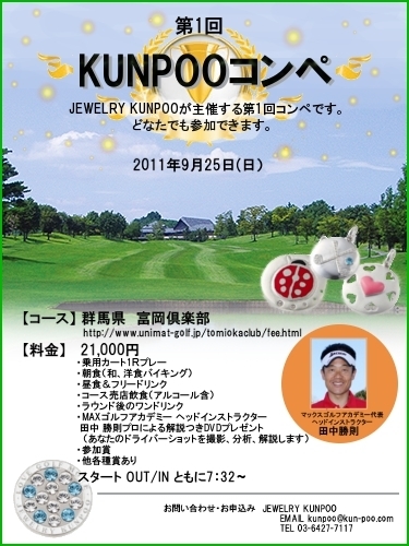 JEWELRY KUNPOO(http://www.kun-poo.com/)が主催する第1回ゴルフコンペです。 誰でも参加できます。 【日程】 2011年9月25日(日) 【コース】 群馬県 富岡倶楽部 http://www.unimat-golf.jp/tomiokaclub/index.html 【コース紹介】 丘陵コース。アウトはフェアウェイやグリーンに微妙なアンジュレーションが施されて個性的。 中でも9番はティ右前方に大きな池があり、グリーン周りも池がへばり付いていて勇気と決断を迫る。 インはアウトと違ってゆるやかな上り、下りのホールが続くため、距離と方向に