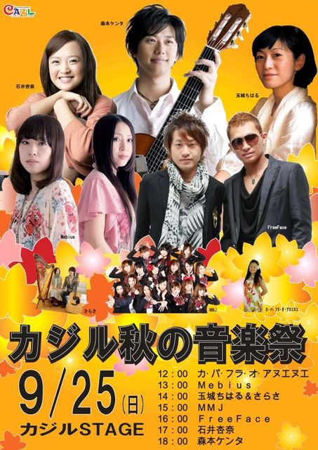 9月25日 カジル秋の音楽祭 日時 2011年 9月 25日 (日) 場所 フレスタモール横川カジル イベントステージ 時間 イベントスタート 12:00 出演 石井杏奈、Mebius、森本ケンタ、Free Face、MMJ、カパフラオアヌエヌエ、 玉城ちはる&さらさ ※観覧無料のフリーイベントです。