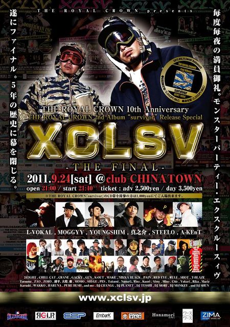 毎度毎夜の満員御礼!!! 広島最大級のHIPHOPパーティー 『XCLSV(エクスクルースィヴ)』!!! 5年に渡りHIPHOPシーンを盛り上げ続けた「XCLSV」!! なんと!今回でファイナル!!!!! ファイナルはこれまで出演して頂いた広島Topアーティスト(MC,Singer,Dancer,DJ)を中心に、東京、大阪、福岡から豪華ゲストを招き盛大に開催!!! 更に、THE ROYAL CROWN 10周年、THE ROYAL CROWN 2nd Album『survivor』リリーススペシャル!!!!! 当日はシャンパン、カクテル、テキーラ、ZIMA振る舞い酒、来場者プレゼント多数アリ!!