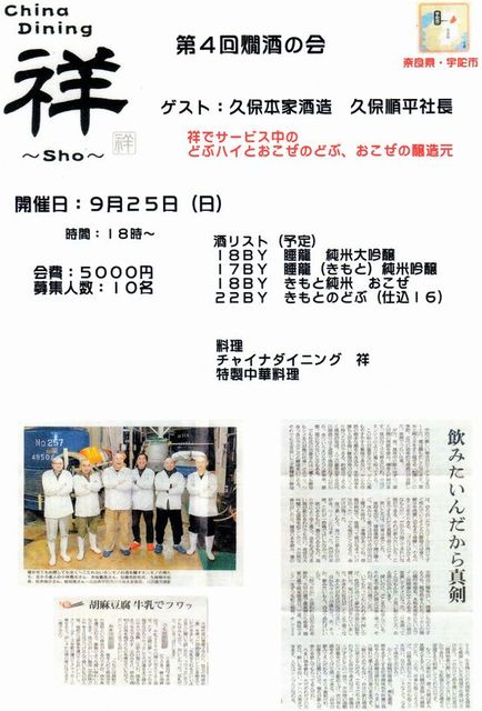 9月25日(日) ゲスト:奈良県宇陀市 久保本家酒造 社長 久保順平氏 会場:チャイナダイニング 翔 会費:5000円 募集人数:10名 お酒:18BY 睡龍 純米大吟醸(速醸) 17BY 睡龍 きもと 純米吟醸 18BY きもと純米 おこぜ 22BY きもとのどぶ(仕込み16) 睡龍 梅酒(きもと純米+梅+蜂蜜) 他・・・いろいろ。 募集期限は満席になれば期限がこなくても締め切ります。