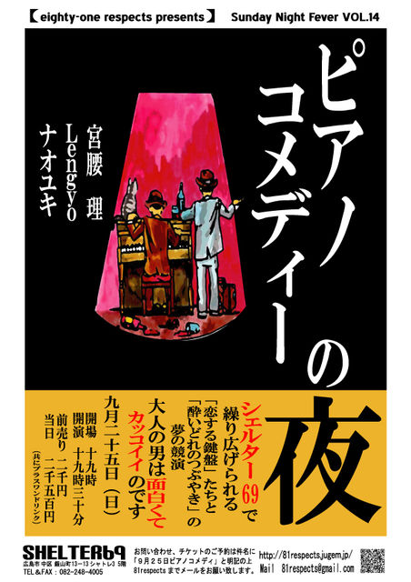【eighty-one respects presents】 Sunday Night Fever vol.14 ピアノコメディーの夜 出演 ナオユキ lengyo 宮腰理 【場所】 広島shelter69 open 19:00 start 19:30 チケット 前売 ¥2,000- 当日 ¥2,500- (共に要ワンドリンクオーダー) ぜひ、お越しください。 チケット予約は私までメッセージいただければ対応できます。 よろしくお願いいたします。