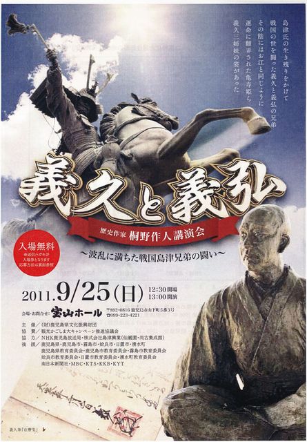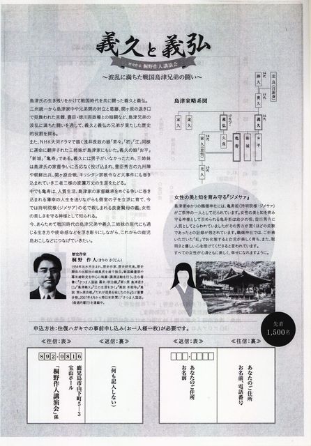 南日本新聞に好評連載中の「さつま人国誌」 http://373news.com/_bunka/jikokushi/index.php を書かれていらっしゃる、桐野作人先生の講演会が開かれます。 日時:9月25日(日)12:30開場、13:00開演 会場:宝山ホール 住所:鹿児島市山下町5−3 電話:099-223-4221 演題:歴史作家 桐野作人講演会 「義久と義弘〜波乱に満ちた戦国島津兄弟の戦い〜」 主催:(財)鹿児島県文化振興財団 往復ハガキでのお申し込みとなります。 画像裏側参照。