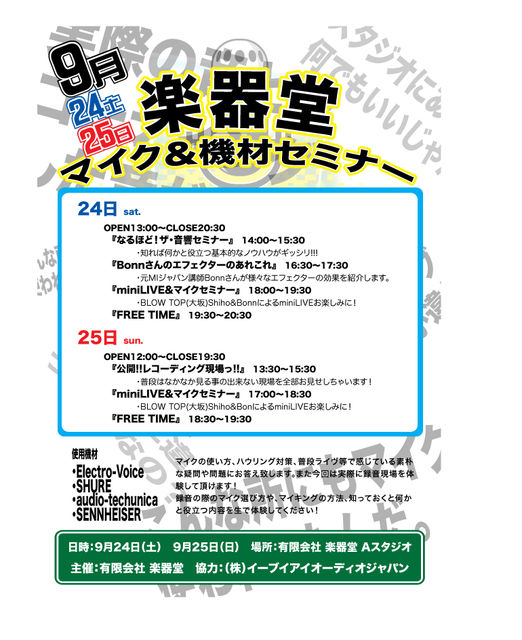 「楽器堂 マイク&機材セミナー」 場所:岡山楽器堂 Aスタジオ 時間:OPEN 12:00 / CLOSE 20:30 料金:観覧無料 <スケジュール> 13:30〜15:30 『公開!!レコーディング現場っ!!』 18:00〜19:30 『miniLIVE&マイクセミナー』 19:30〜20:30 『FREE TIME』 ※BLOW TOPよりShiho&Bonnによるデモンストレーション、ミニLIVEを予定 --------------------------------- 楽器堂 岡山県岡山市北区野田一丁目9-104 Tel:(086)245-3395 http://www.gakkido.com/ EVI AUDIO Japan: http://www.eviaudio.co.jp/ 主催:有