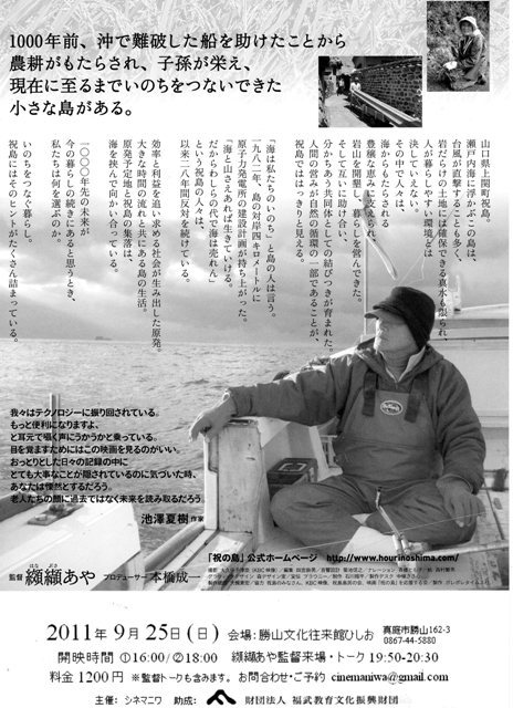 イベント告知失礼致します。 ◎シネマニワ上映会◎ 映画『祝の島』(ほうりのしま)2010年/日本/105分 10月29日から岡山巡回上映されるシネマニワ協力映画『ひかりのおと』とこの『祝の島』、”地域の視点”という意味ですごく共通しているのではないかと思う。纐纈(はなぶさ)あや監督をお招きし、地域というキーワードで皆さんとも一緒に話せたらと思っています。 日時:2011年9月25日(日)?16:00〜 /?18:00〜 19:50〜20:30 纐纈(はなぶさ)あや監督来場トーク 会場:勝山文化往来館