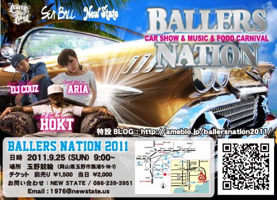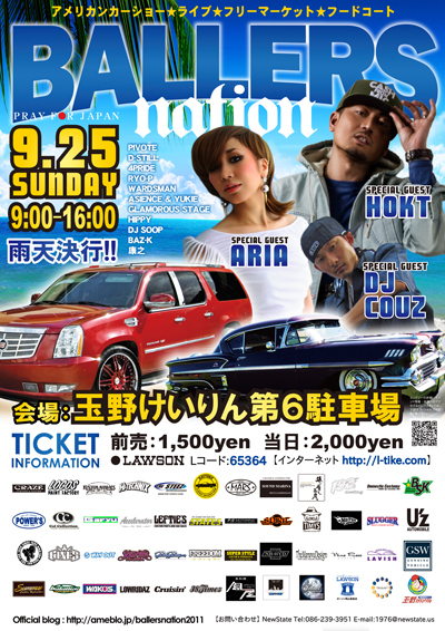 岡山県玉野市の「玉野けいりん第6駐車場」にてアメ車のイベントがあります 【開催日】 2011/09/25 (Sun) 雨天決行! 【時 間】 OPEN 9:00〜16:00 【タイトル】 BALLERS NATION 2011 【会 場】 岡山県玉野市 / 玉野競輪第6駐車場 【住 所】 〒706-0002 岡山県玉野市築港5-18-1 【T E L】 0863-32-2030 (SEA BALL) 【料 金】前売 : \1,500 当日 : \2,000 【ローソンチケット】 L コード:65364 【お問い合わせ】 SEA BALL 岡山県玉野市田井1-6-18 TEL:0863-32-2030 Email:seaball0619@kub.biglobe.ne.j