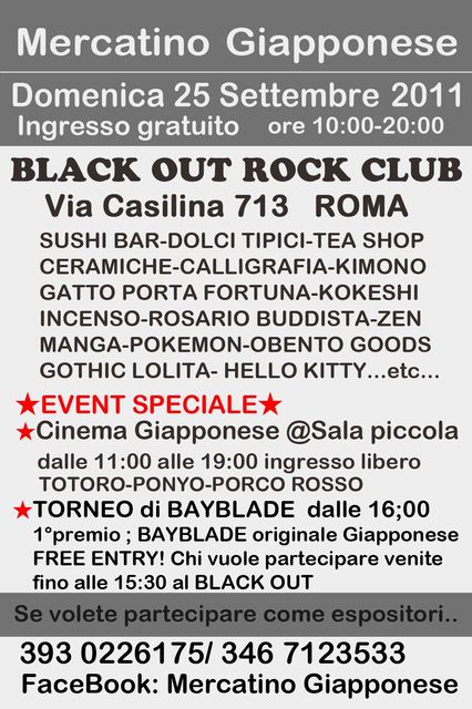長い長ーい夏休みもやっと終わりが見えて来た今日この頃、皆様いかがおすごしですか? MERCATINO GIAPPONESEも長い夏休みを終えて9月からまた始動します。 今回は初の試みとして、屋内の一部屋を映画鑑賞の為に解放します。 上映予定映画はトトロ、紅の豚、ポニョ等で入場無料です。 (日本語 、イタリア語の吹き替え、字幕かは当日のお客様の比率で考慮します) 上映時間は11時から夜7時までノンストップです。 そして男の子のお母様達に朗報です(私もそうなのですが・笑) ベイブレード大会やります! 優勝商品は日本購入の